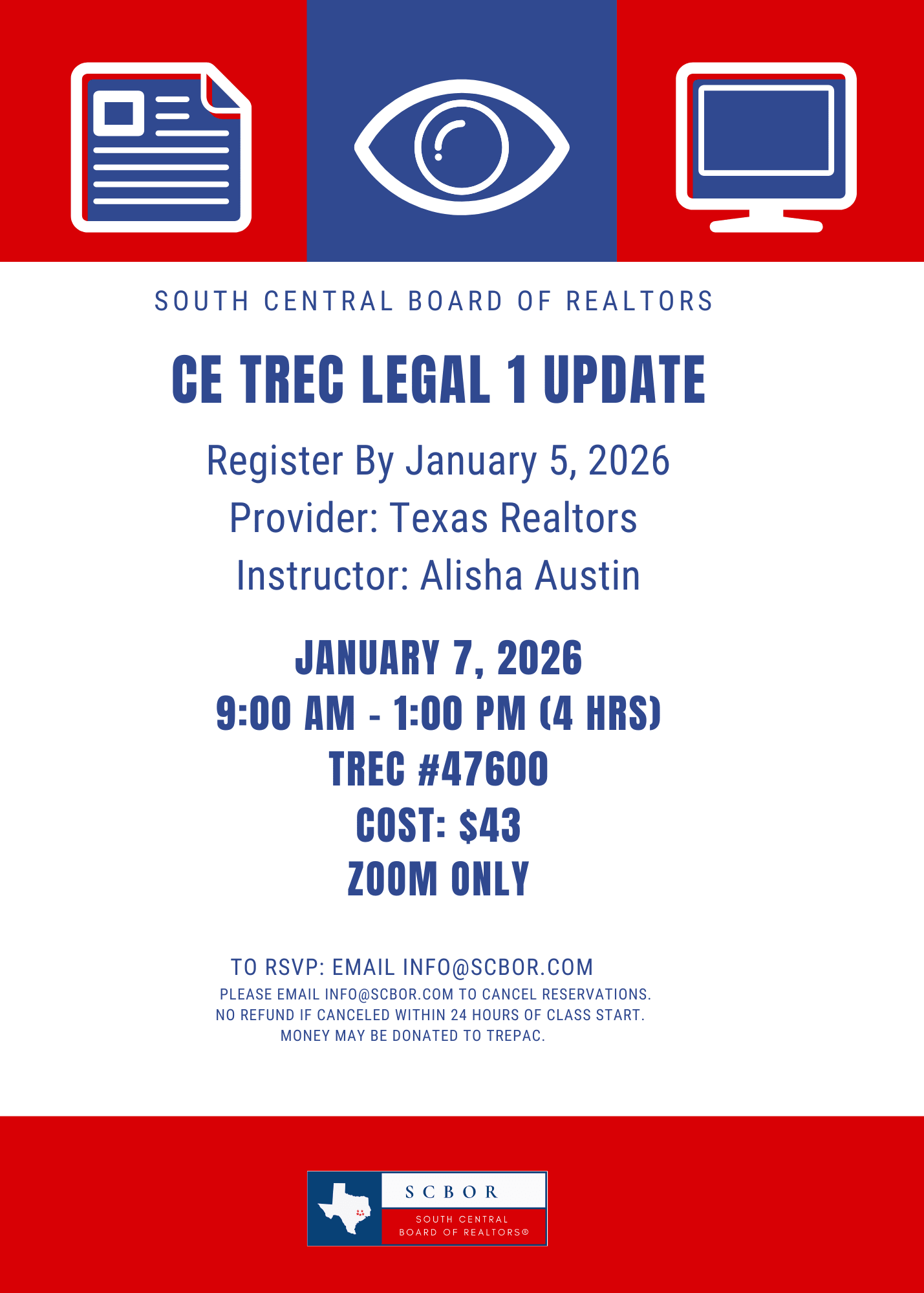 Did you know that as a license holder you have legal requirements and regulations for engaging in the real estate business? Perhaps you also belong to a trade association connected to the real estate business that has a code of conduct and you see that as a requirement for engaging in the business. There is more to your requirements than a trade association expectations. It is every license holder’s responsibility to know and operate under the current laws applicable to their license. The course covers the requirements Texas law places upon all license holders regard ing ethical conduct when facilitating a real estate transaction. This TREC Legal 1 Update #47600 will be instructed by Alisha Austin from 9 AM - 1 PM on Zoom. Make sure to register and pay for this class by January 5, 2026. Zoom link and curriculum will be sent 2 days before this CE.